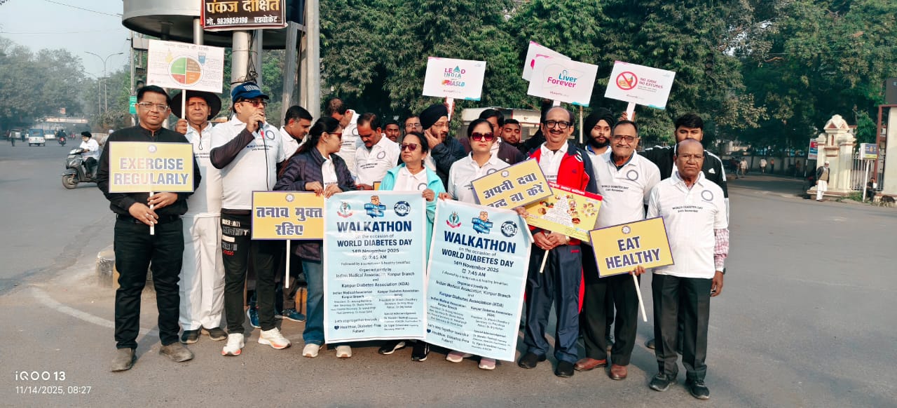 14 Nov 2025, Kanpur: विश्व मधुमेह दिवस 2025 के अवसर पर इंडियन मेडिकल एसोसिएशन कानपुर शाखा एवं कानपुर डायबिटीज एसोसिएशन के संयुक्त तत्वावधान में एक विशाल “वॉकाथॉन 2025” का आयोजन आई.एम.ए. परेड में किया गया। यह कार्यक्रम इस वर्ष की थीम “मधुमेह और कल्याण ” पर आधारित था, जिसका उद्देश्य मधुमेह के प्रति जागरूकता बढ़ाना, उसके जोखिमों को समझाना तथा लोगों को एक स्वस्थ जीवनशैली अपनाने के लिए प्रेरित करना है।